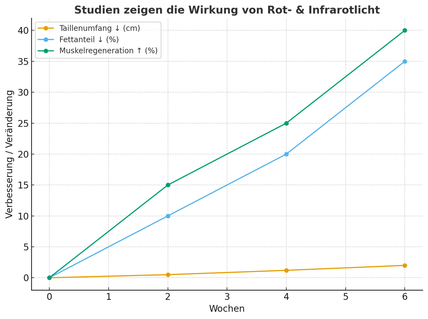 In einer Studie mit übergewichtigen Frauen (20–40 Jahre), die regelmäßig Training machten & zusätzlich Lichttherapie erhielten, gab es bessere Ergebnisse bei Fettabbau & Umfang der Taille als bei der Kontrollgruppe ohne Lichttherapie. Ebenso wurde Fett- und Cellulitereduktion befördert.